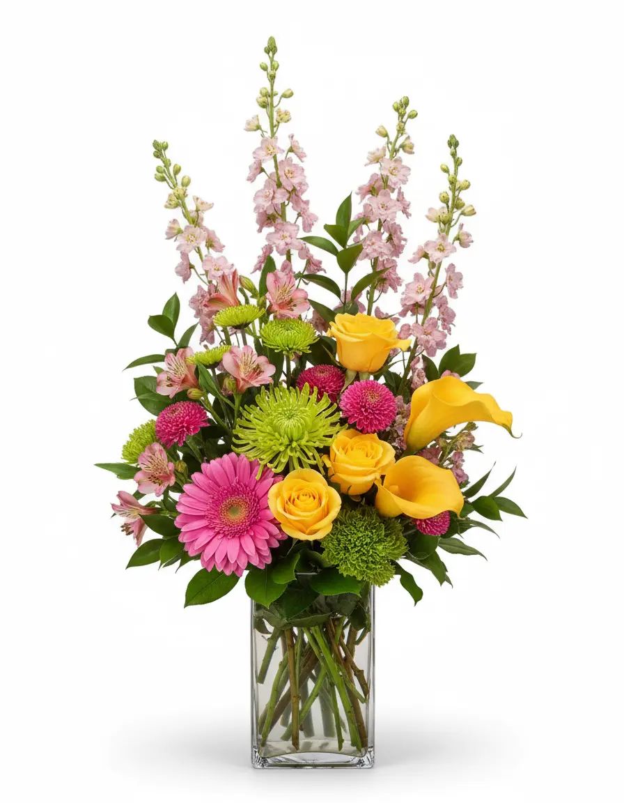 Experience the radiant beauty of our Golden Meadow Harmony bouquet, a captivating blend of cheerful yellow callas, elegant roses, and vibrant alstroemeria. Lush greens like spider poms and ruscus provide a refreshing contrast, creating a stunning visual symphony. This uplifting arrangement is perfect for brightening any space or celebrating a special moment with its natural charm.